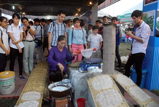 Du khách tham quan trải nghiệm cách làm bánh tráng.