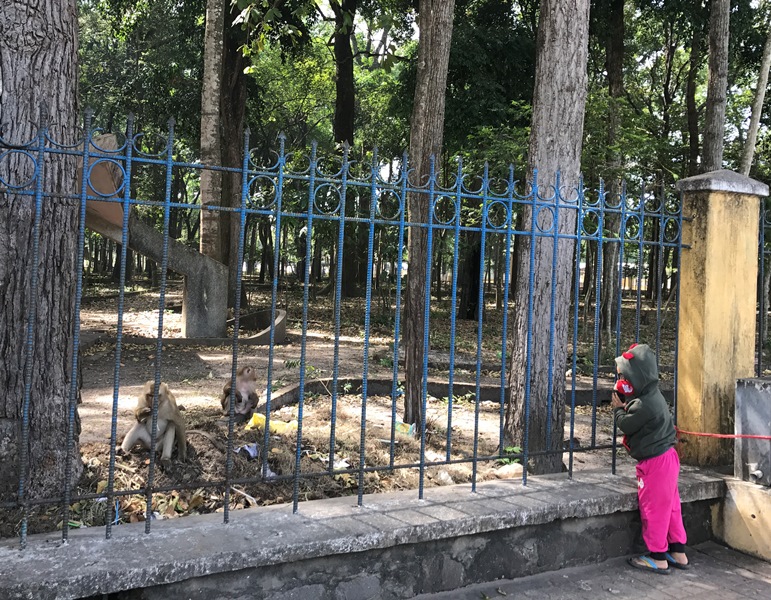 Trẻ em lại gần những chú khỉ.