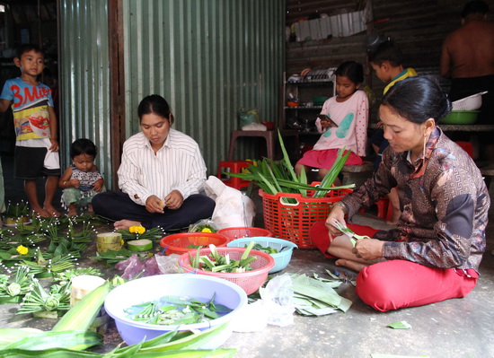 Năm nay, rằm tháng 10 (nhằm ngày 31.10) là ngày lễ củng trăng của đồng bào dân tộc Khmer, khoảng 11 giờ, nhà ông Cao Văn Ươn và bà Cao Thị Tuôl đã bắt đầu nổi lửa, chuẩn bị nướng cơm ống. Ông chuẩn bị hai cục đá to kê ở hai đầu, gác lên trên thân 1 cây chuối to. Sau đó, ông Ươn xếp những ống tre đã cho gạo và nước vào trong thành hai dãy bên cạnh thân chuối. Miệng ống tre được bịt lại bằng mớ lá chuối, hướng lên trên. So với các nhà trong xóm, nhà ông bà làm bánh sớm hơn một chút. “Nhà tôi đông con, tôi làm đến 7 kg nếp. Sáng tôi mang cơm vô dâng cúng cho sư rồi về làm sớm mới kịp”, bà Cao Thị Tuôl vừa cho nếp vào ống tre, vừa nói.