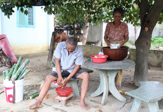 Vợ chồng ông Cao Văn Ươn và bà Cao Thị Tuôl chuẩn bị làm cơm ống tre.