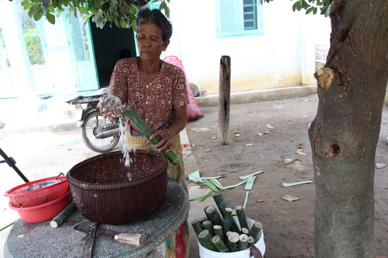 Bà Cao Thị Tuôl cho các nguyên liệu vào ống tre, chuẩn bị nướng.