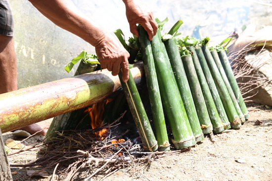 Xếp ống tre chuẩn bị nướng.