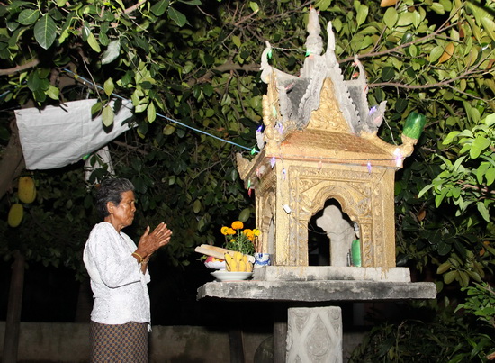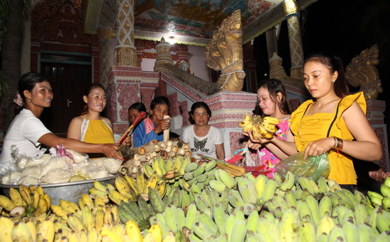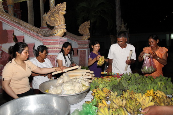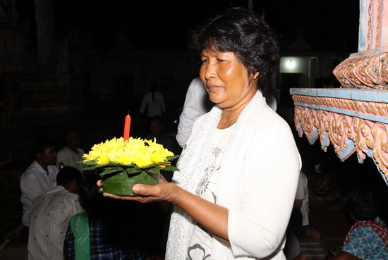 Từ những chiếc lá phát tài, lá dứa, thân chuối, chị Thích khéo léo kết thành những chiếc đèn hoa đăng. Tối đến, ngoài những lễ vật mang cúng chùa, trên tay bà con còn có những chiếc đèn hoa đăng, thả xuống hồ nước trước chùa Botumkirirangsey với những mong ước riêng của mình.