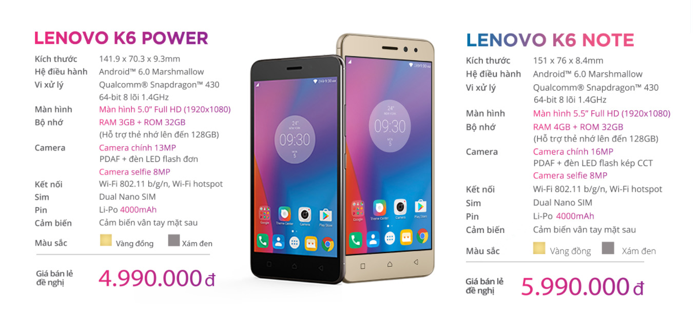 Tương tự như trên, K6 Note sở hữu camera chính 16 MP, camera selfie 8 MP còn K6 Power là 13 MP và 8 MP. Bộ nhớ trong của hai chiếc smartphone đều là 32 GB và có thể mở rộng dung lượng bộ nhớ trong qua khe cắm thẻ nhớ micro-SD. Lenovo K6 Note và K6 Power đều hoạt động trên nền tảng Android 6.0, dung lượng pin của hai đạt mức 4.000 mAh và hỗ trợ sử dụng 2 SIM.