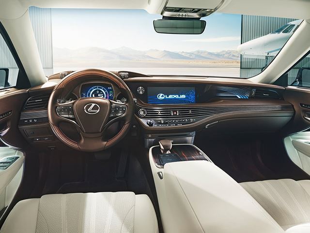 Màn hình màu hiển thị thông tin trên kính chắn gió có kích thước 24 inch, tính năng tự động đánh lái và hệ thống phát hiện điểm mù ở giao lộ là 3 công nghệ an toàn độc đáo của Lexus LS 2018.