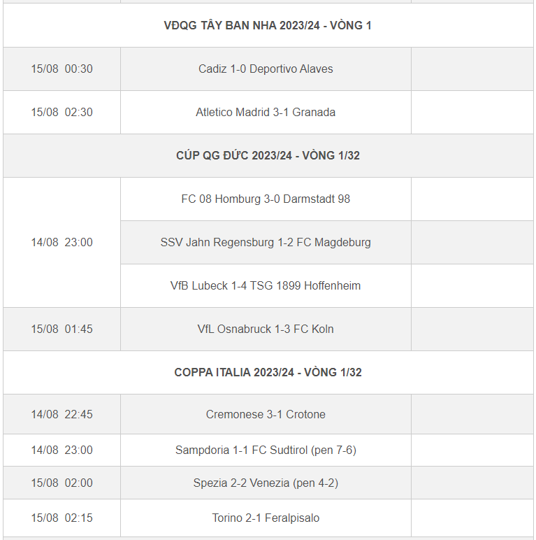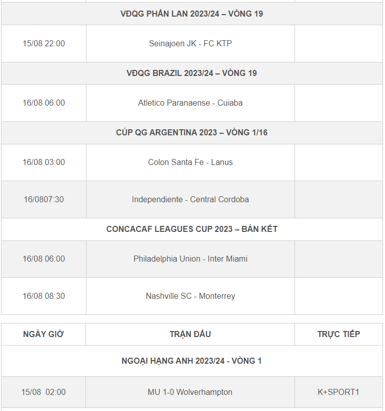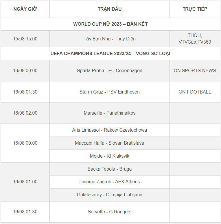 Cung cấp lịch thi đấu bóng đá hôm nay 15/8/2023, với vòng bán kết World Cup nữ và các giải đấu tại châu Âu, châu Á và châu Mỹ đêm nay, rạng sáng mai.