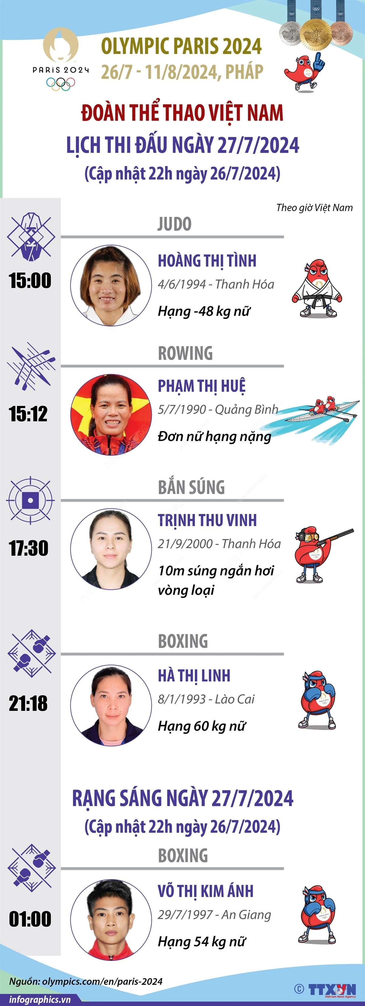 Ngày 27/7 và rạng sáng ngày 28/7 sẽ có 5 vận động viên của Đoàn Thể thao Việt Nam tranh tài tại Olympic Paris 2024 ở 3 môn thi đấu là Hoàng Thị Tình (Judo), Phạm Thị Huệ (Rowing), Trịnh Thu Vinh (Bắn súng); Hà Thị Linh và Võ Thị Kim Ánh (boxing)./.