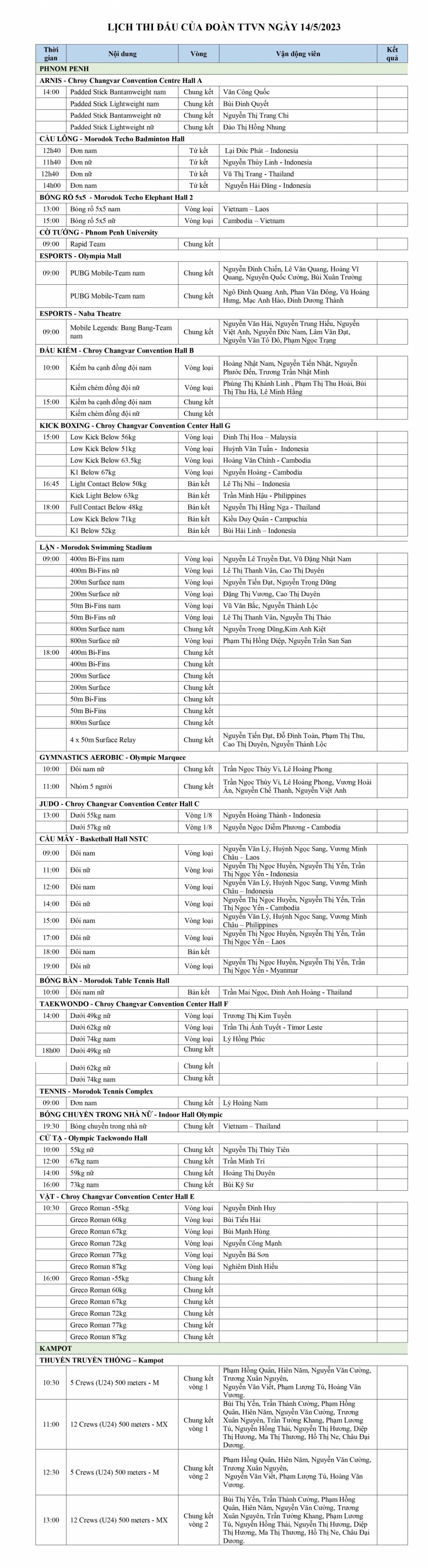 Lịch thi đấu SEA Games 32 ngày 14/5 của Đoàn thể thao Việt Nam.