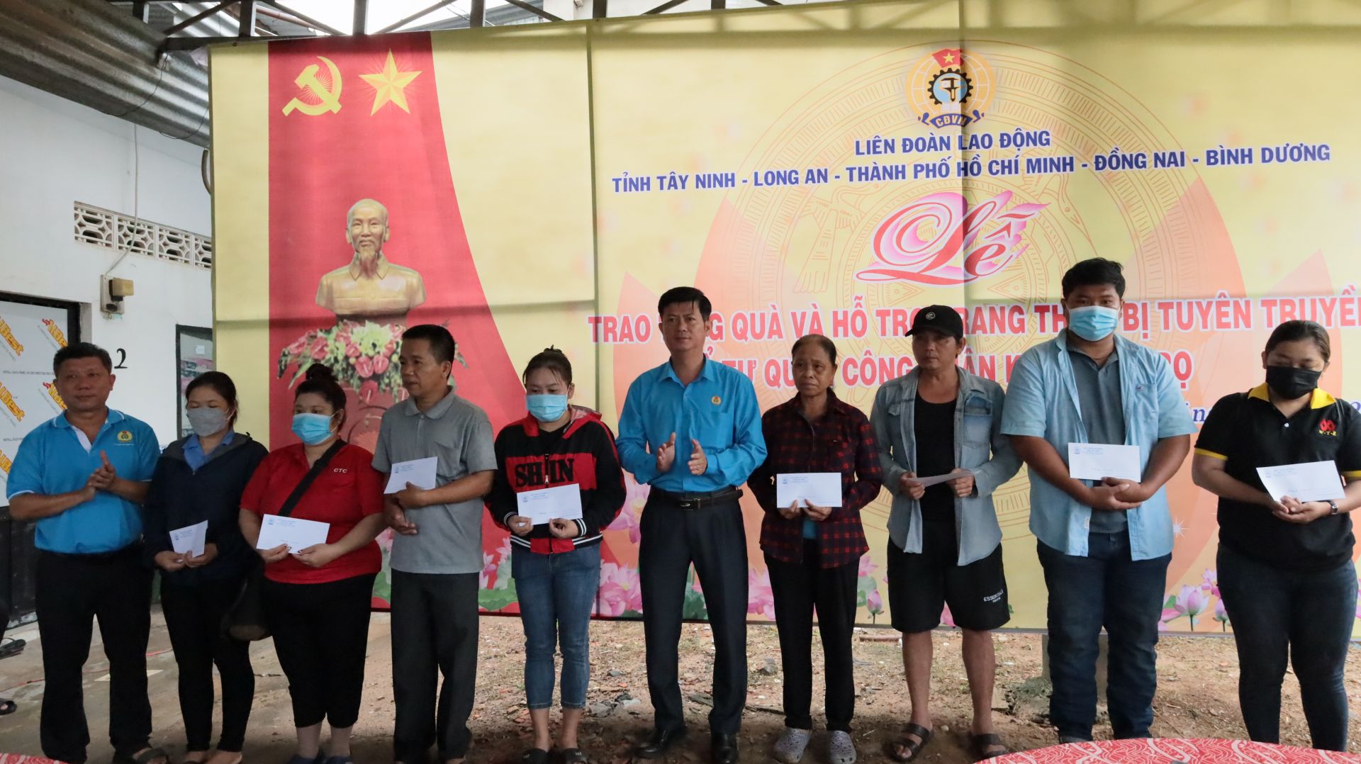 Sáng 27.5, Liên đoàn Lao động tỉnh Tây Ninh phối hợp Liên đoàn Lao động các tỉnh: Đồng Nai, Bình Dương, Long An và Thành phố Hồ Chí Minh tổ chức trao tặng trang thiết bị tuyên truyền cho tổ tự quản công nhân khu nhà trọ (ấp Phước Đức B, xã Phước Đông, huyện Gò Dầu) và tặng quà cho người lao động có hoàn cảnh khó khăn.