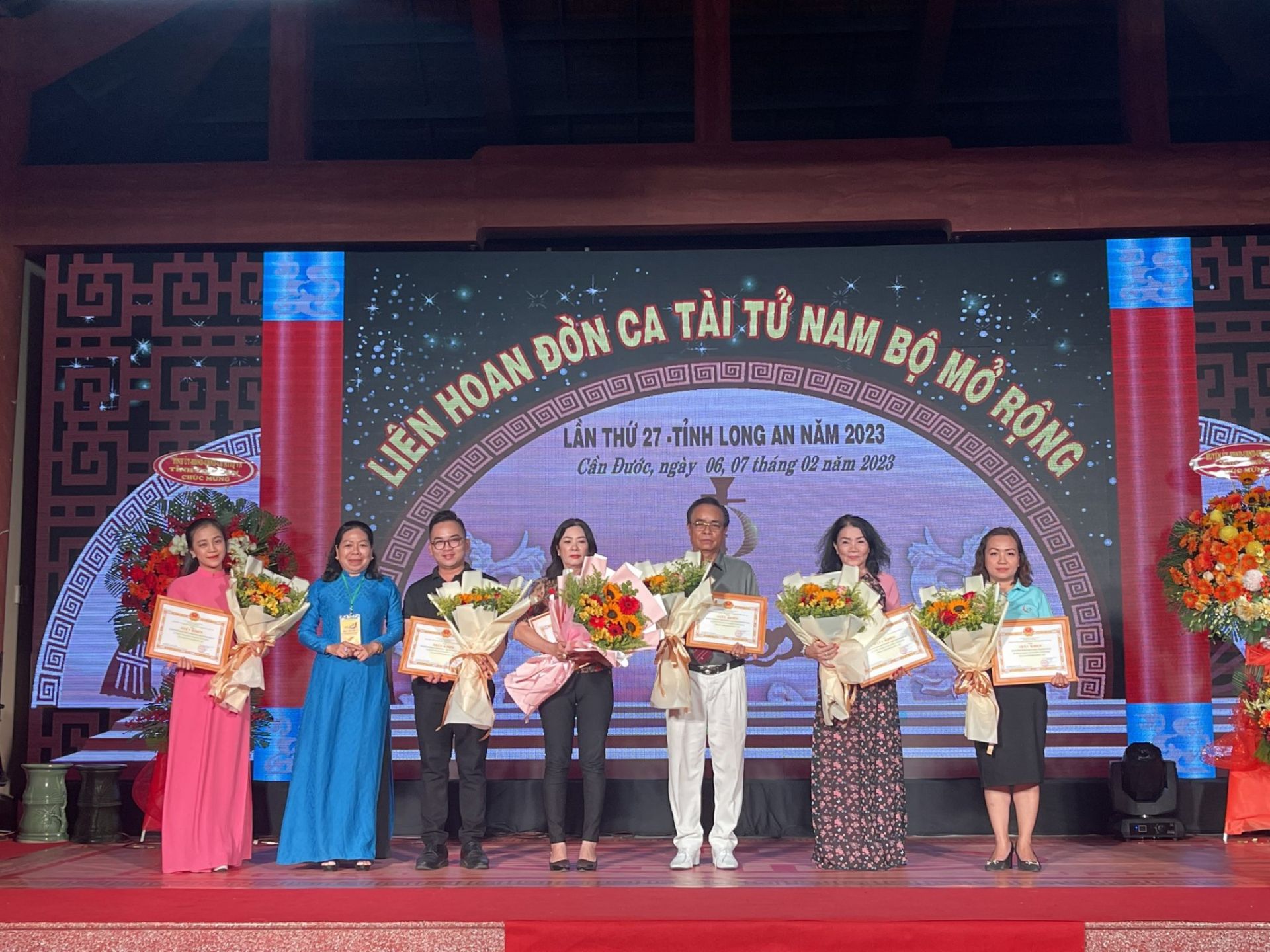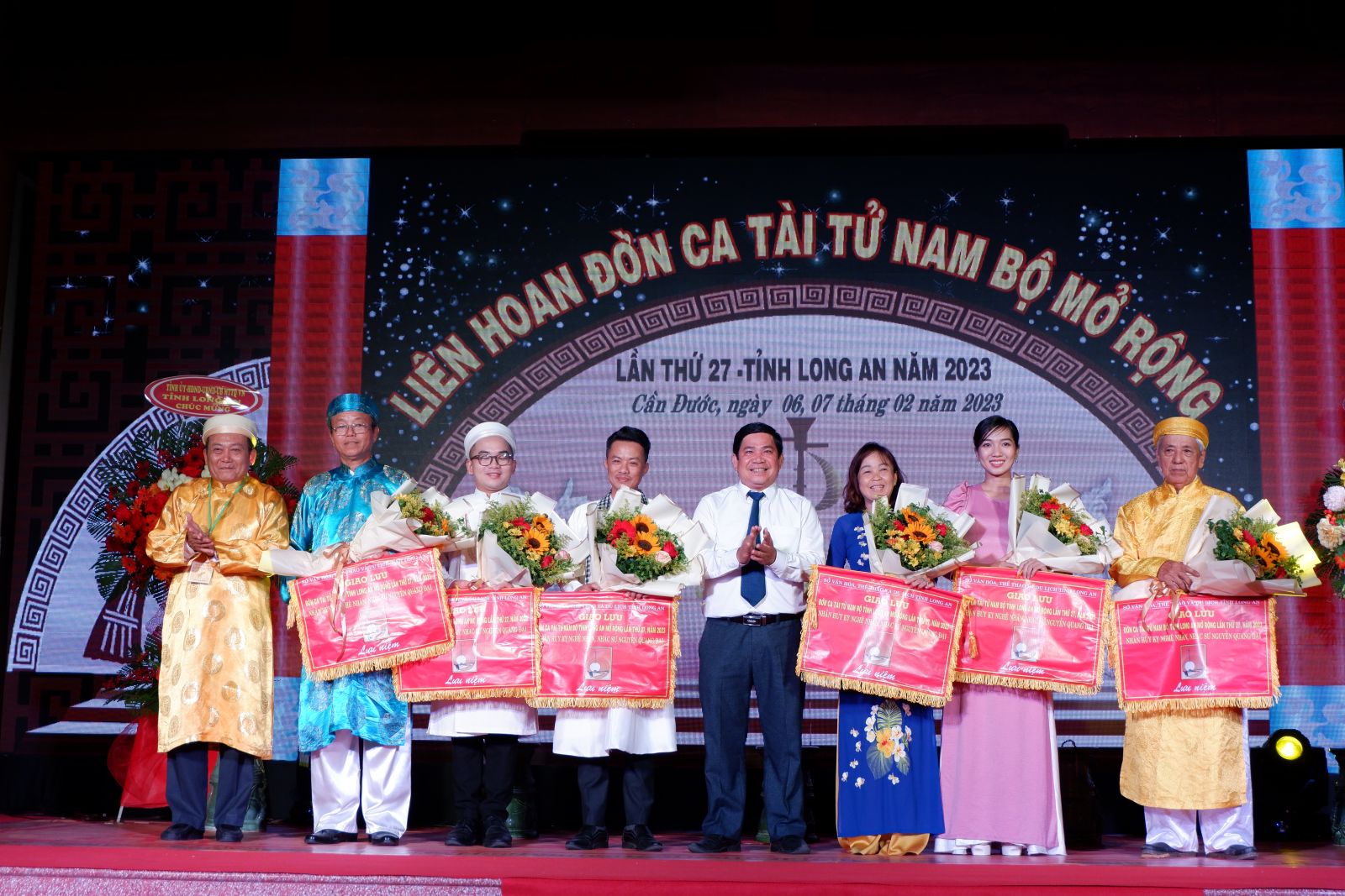 BTC tặng hoa và cờ cho các ban đờn ca tài tử tham gia liên hoan.