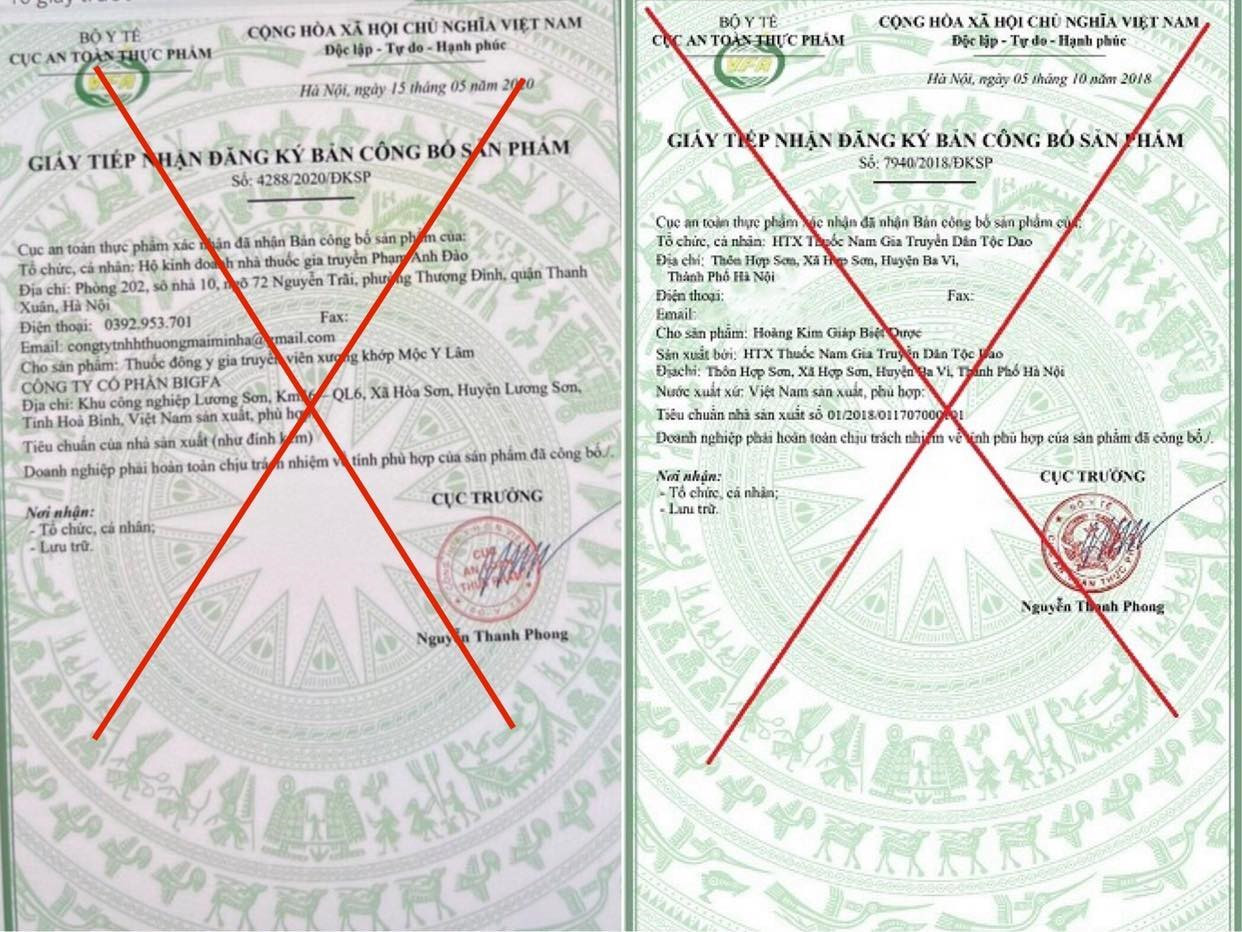 Cục An toàn thực phẩm cảnh báo 2 Giấy công bố sản phẩm này là giả mạo. Ảnh: VFA