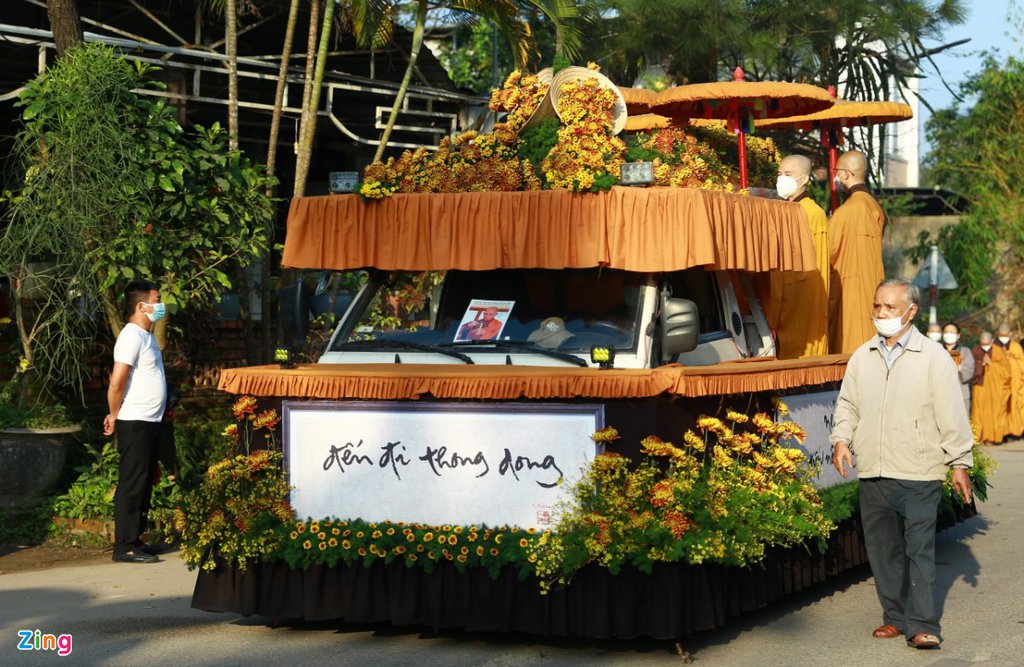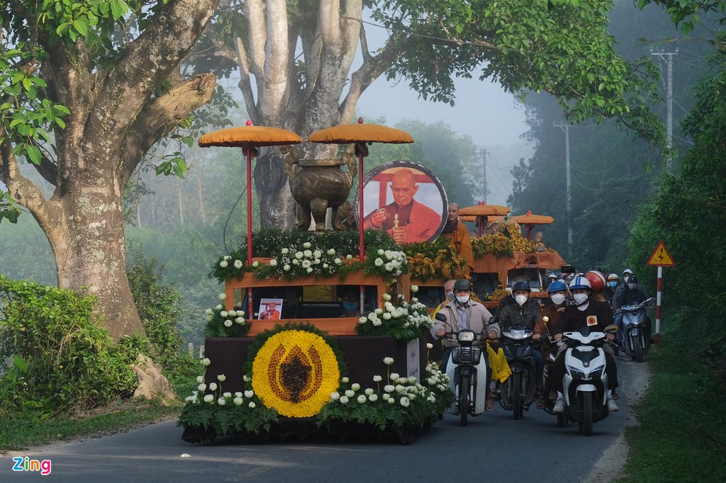 Xe chở linh cữu thiền sư Thích Nhất Hạnh đi qua đường Minh Mạng. Quãng đường từ Tổ đình Từ Hiếu đến Vườn Địa Đàng khoảng 12 km. 7h ngày mai (30/1), Ban giám tử sẽ thực hiện lễ cung thỉnh xá lợi trở về Tổ đình Từ Hiếu. Khoảng 8h30 sẽ diễn ra lễ giác linh an vị.