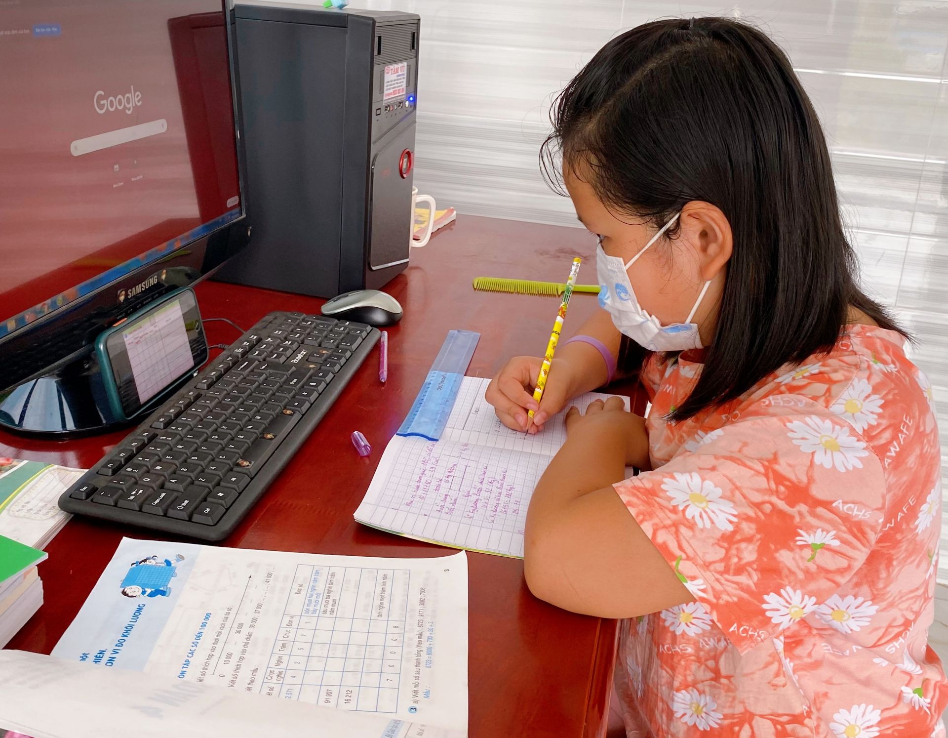 Học sinh tiểu học tham khảo các bài học online tại nhà giữa mùa dịch. Ảnh: Huy Hoàng