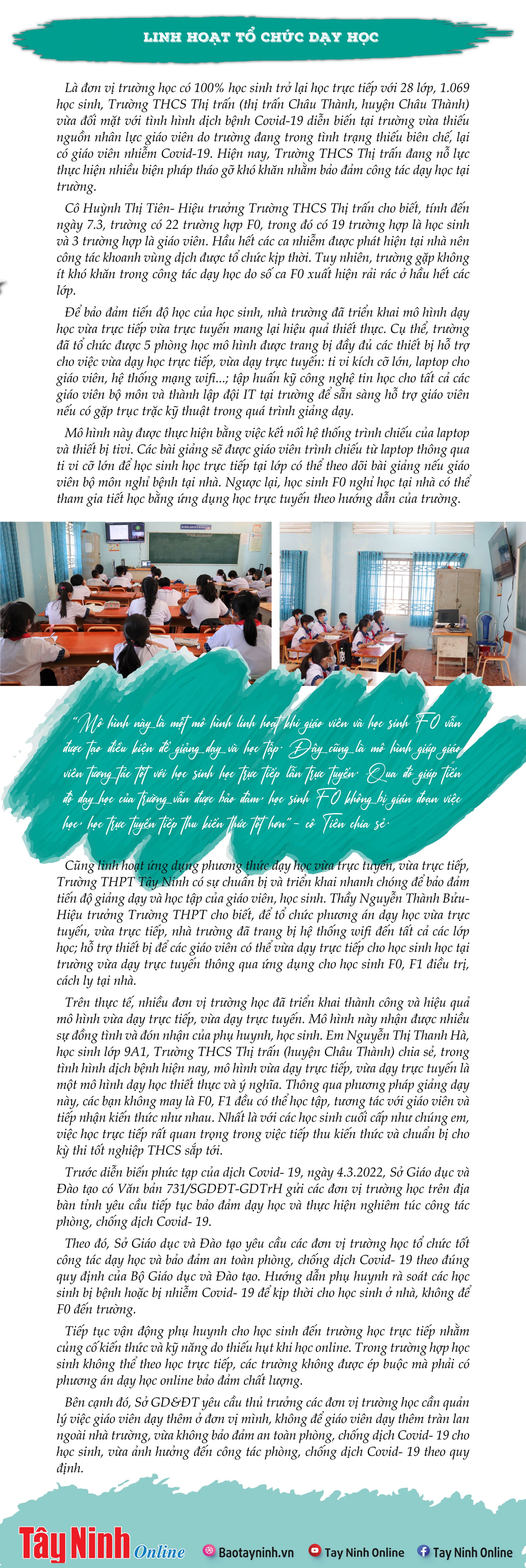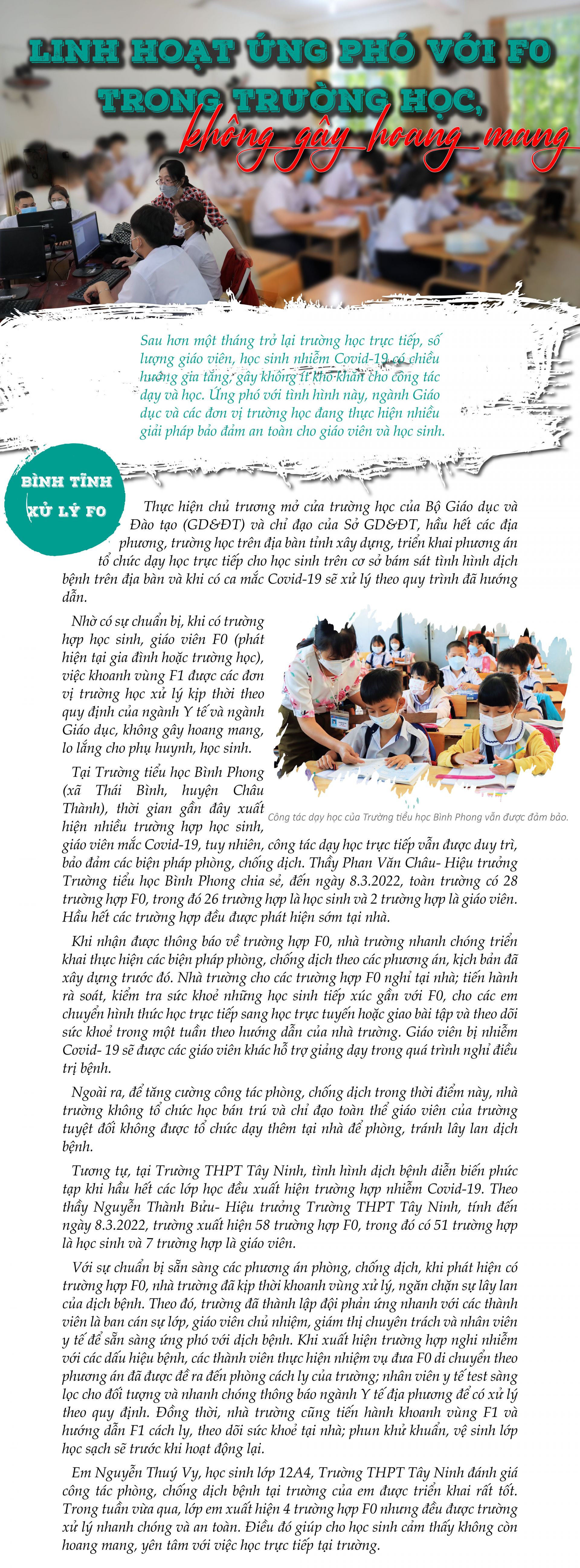 Sau hơn một tháng trở lại trường học trực tiếp, số lượng giáo viên, học sinh nhiễm Covid-19 có chiều hướng gia tăng, gây không ít khó khăn cho công tác dạy và học. Ứng phó với tình hình này, ngành Giáo dục và các đơn vị trường học đang thực hiện nhiều giải pháp bảo đảm an toàn cho giáo viên và học sinh. |