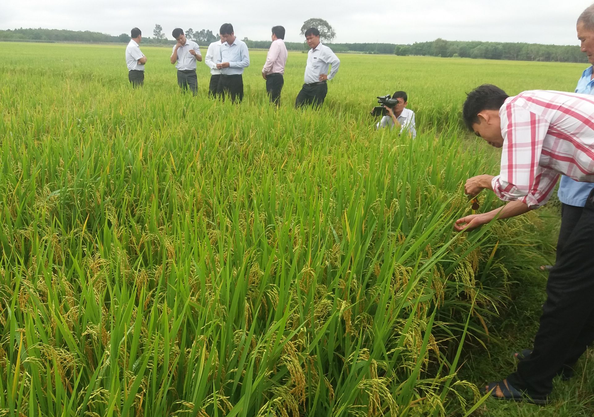 Đoàn kiểm tra chất lượng lúa thử nghiệm của Trạm Khuyến nông huyện Châu Thành.