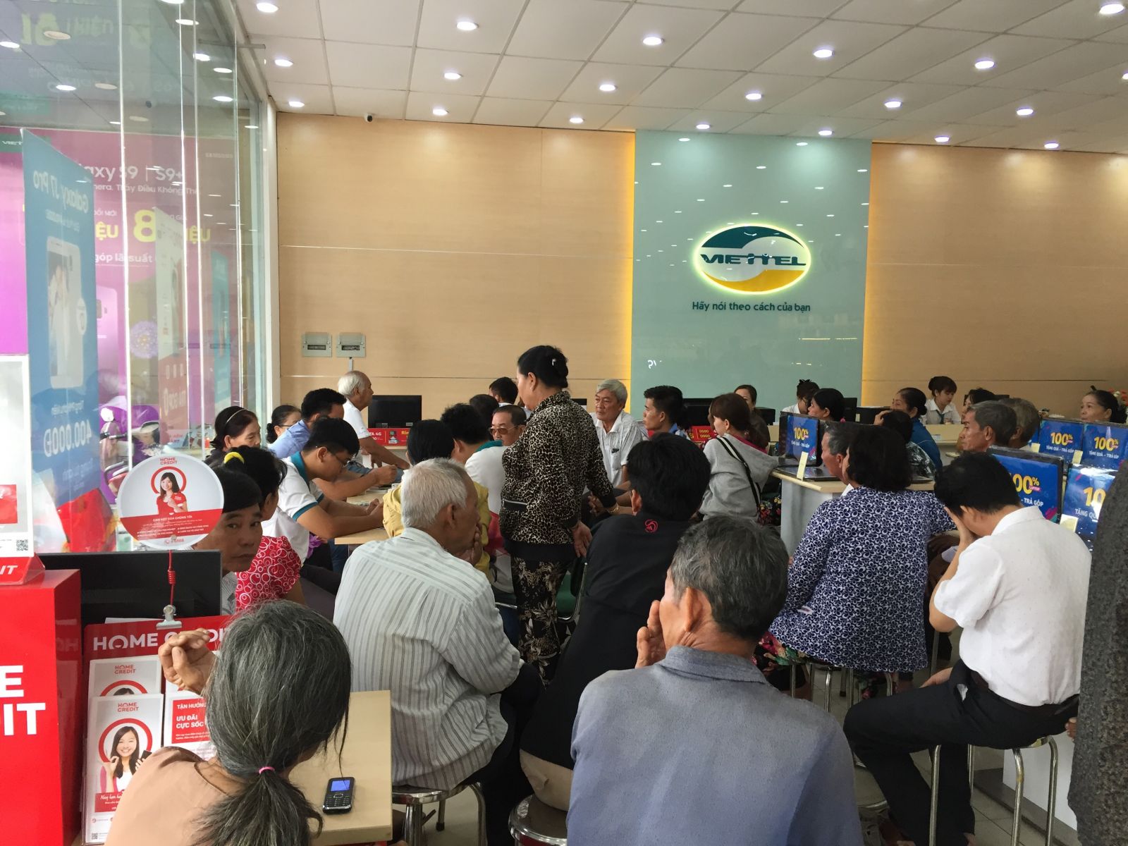 Phía trước chi nhánh Viettel Hòa Thành không còn chỗ đậu xe do người dân chen nhau đến đăng ký thông tin. |
