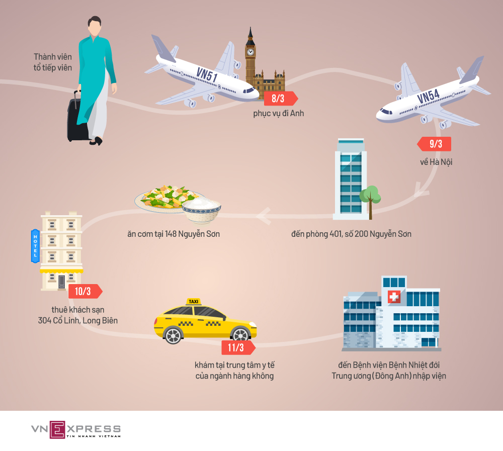 "Bệnh nhân 46" là tiếp viên trên chuyến bay đi về London - Việt Nam ngày 6-9/3, nghỉ ở tòa nhà đoàn tiếp viên và một khách sạn tại Hà Nội, trước khi xác định dương tính.