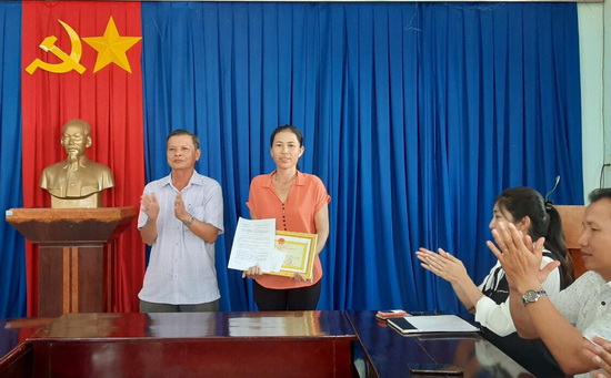 Lãnh đạo xã trao giấy khen cho chị Lãnh.