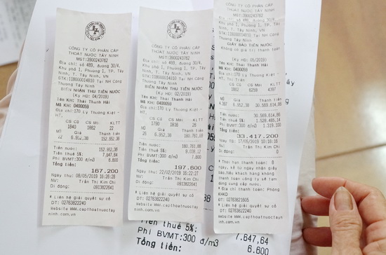 Tá hỏa trước giấy báo tiền nước tăng vọt, bà Huê đã phản ánh đến Công ty CP Cấp thoát nước Tây Ninh. “Chúng tôi đến phản ánh, xin giảm tiền nước, nhưng phía công ty không giảm, mà cho chúng tôi trả góp tiền nước mỗi tháng 2 triệu đồng, cộng với tiền nước tiêu thụ hằng tháng”, bà Huê nói.