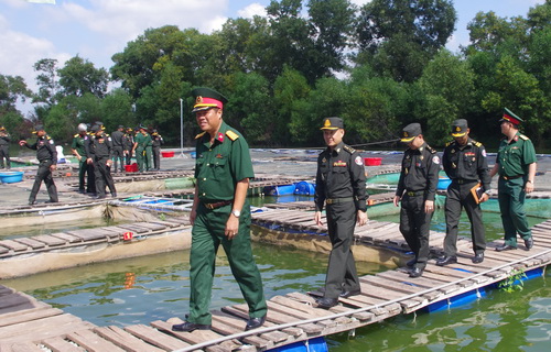 Đại tá Huỳnh Tấn Hùng- Phó Sư đoàn trưởng Sư đoàn 5 hướng dẫn các thành viên Đoàn công tác tham quan mô hình nuôi cá lồng bè tại Sư đoàn 5.