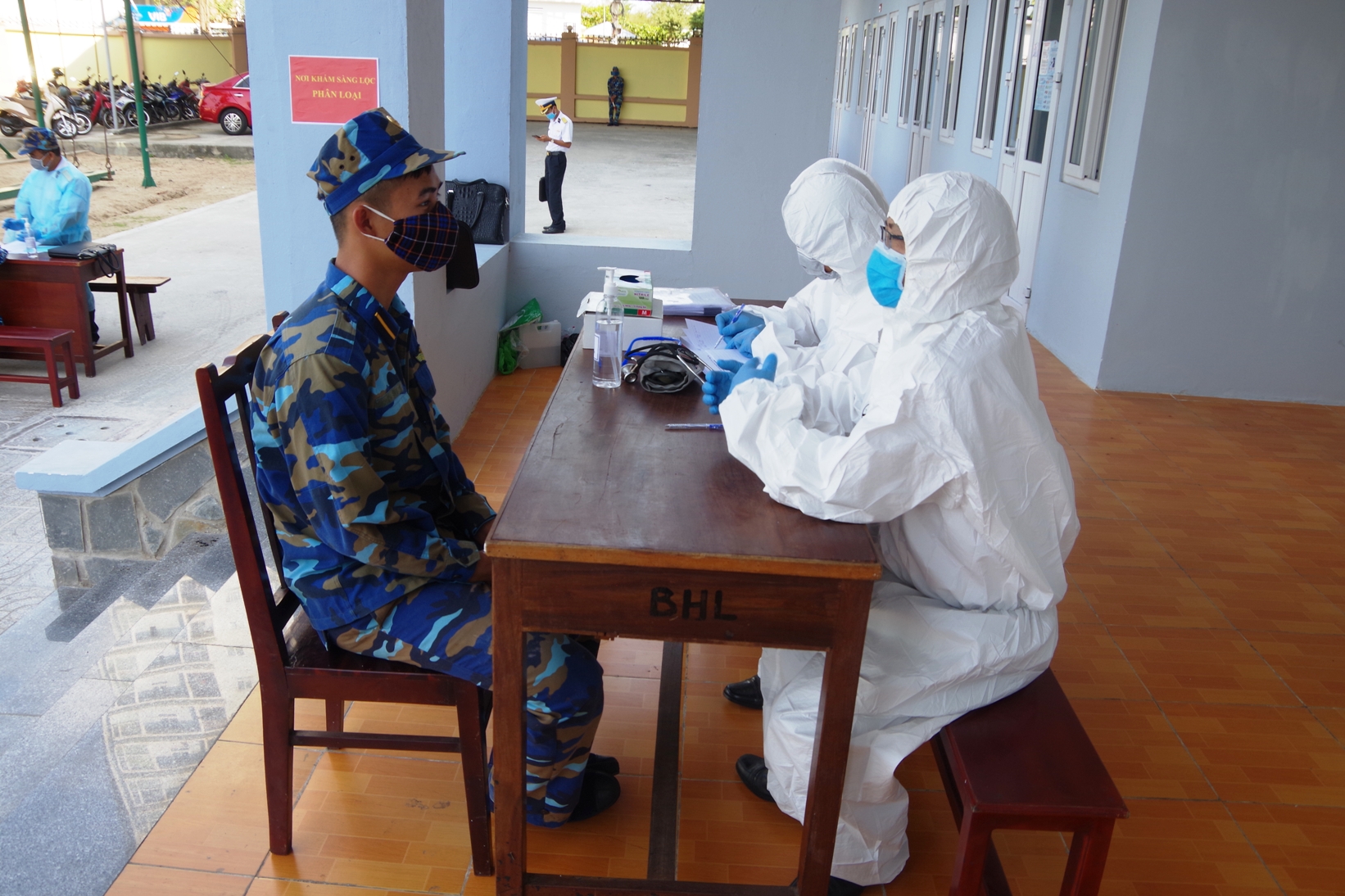 Các bác sĩ luyện tập tiếp nhận và khai báo y tế cho người đến cách ly- Ảnh Đặng Đồng