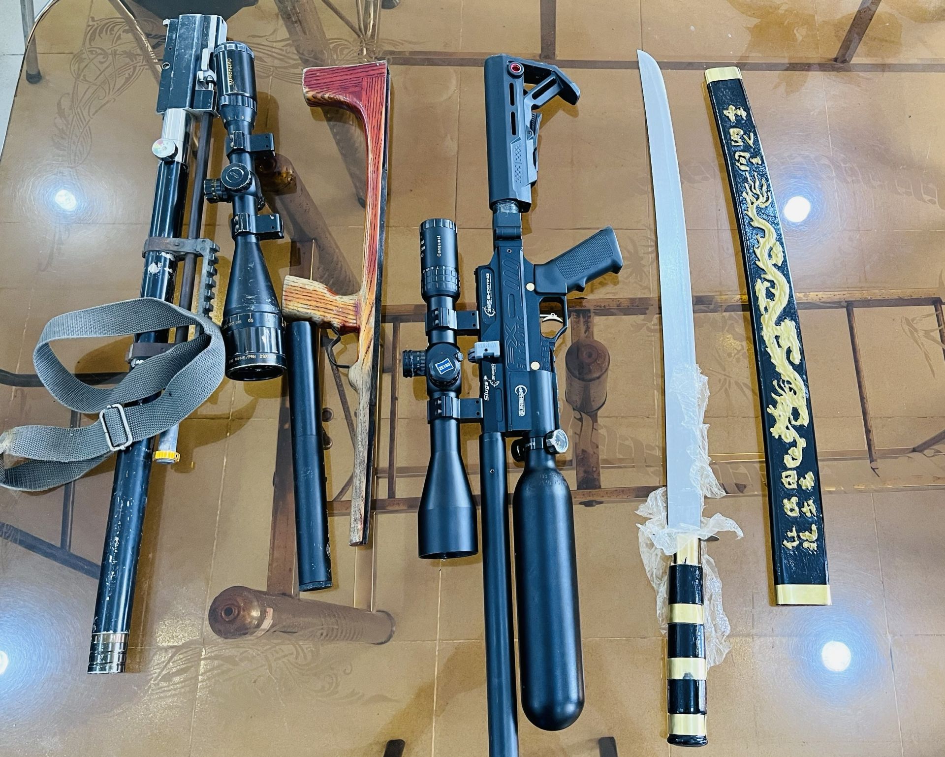 Công an thu giữ thiết bị súng hơi tự chế, vũ khí thô sơ, đao, kiếm.