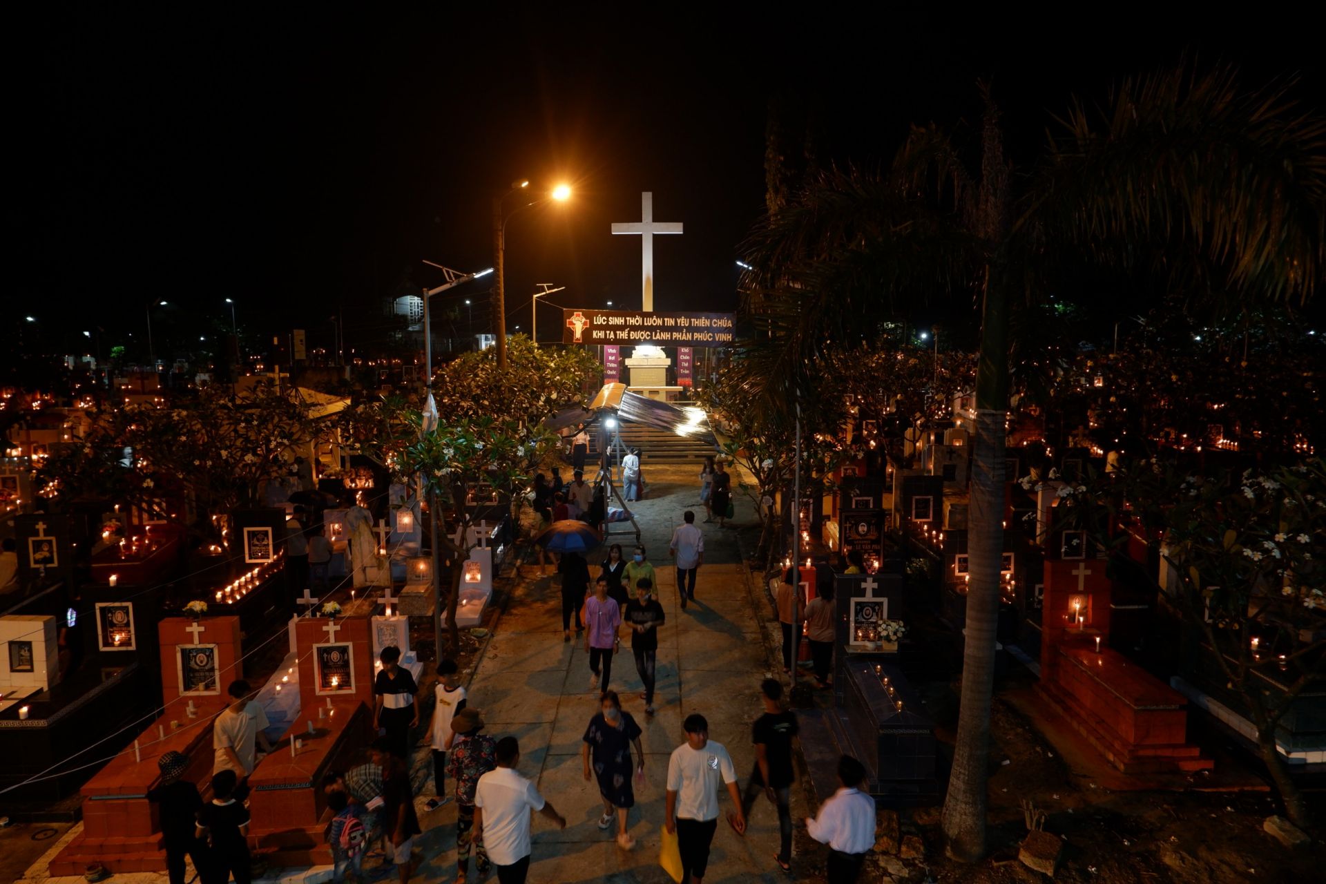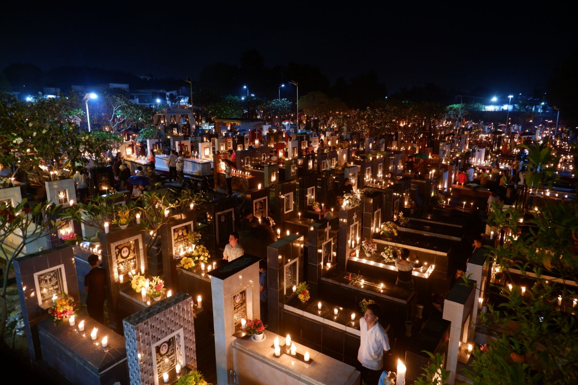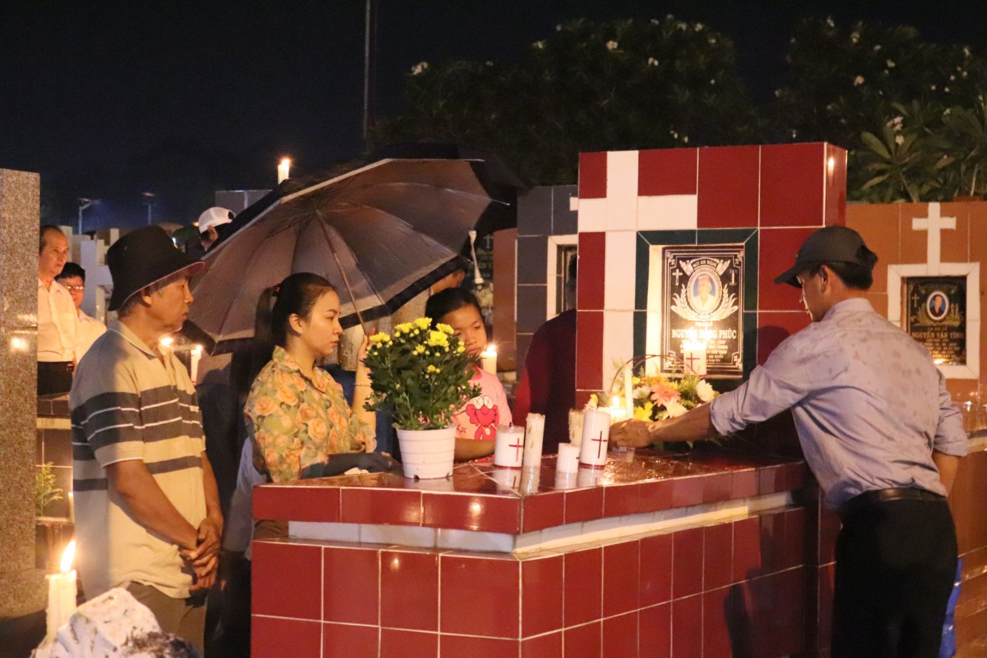 Các gia đình người Công giáo thắp nến trên phần mộ tổ tiên. Ảnh: Minh Trí