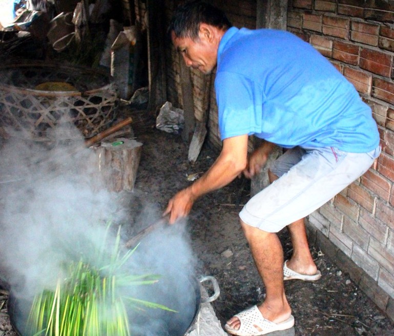 Ông Hiểu cẩn thận luộc từng bó lá. |
