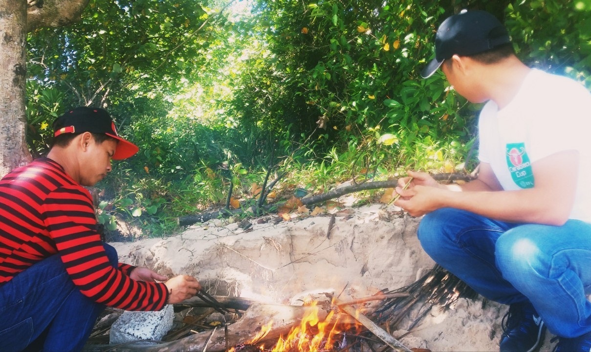 Sau “3 nốt nhạc” như lời cam kết, anh Thọ- chồng chị Tới, cũng cập bờ, mang theo xô nhựa đựng gần 20 con cá nâu to bằng bàn tay và chừng chục con cá mú. Anh bẻ cây khô và nhóm lửa ngay dưới kẹt đá. Trong khi chờ củi biến thành than, anh Thọ lấy mảnh vỏ hàu cắt ngang vỏ chai nước suối làm ly đựng rượu, rồi tán nhuyễn mớ muối hột trộn với ít bột ngọt để làm thức chấm và tranh thủ “tám” về cái tên hòn ở quê mình.