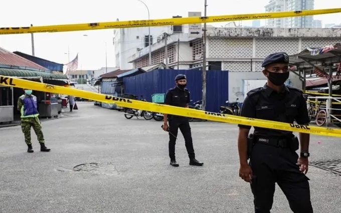 Cảnh sát đứng gác tại lối vào một khu chợ tại Kuala Lumpur, Malaysia, ngày 27-3. (Ảnh: Reuters)