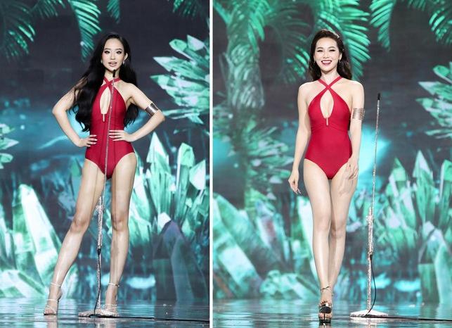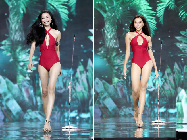 Trong phần trình diễn bikini, các thí sinh diện áo tắm một mảnh tông màu đỏ đậm với đường xẻ sexy ở vòng một. Trang phục này được nhận xét khá kín đáo tuy nhiên vẫn tôn đường cong và giúp thí sinh che được nhược điểm. Phần thi bikini là lúc dàn thí sinh “bung” kỹ năng catwalk.