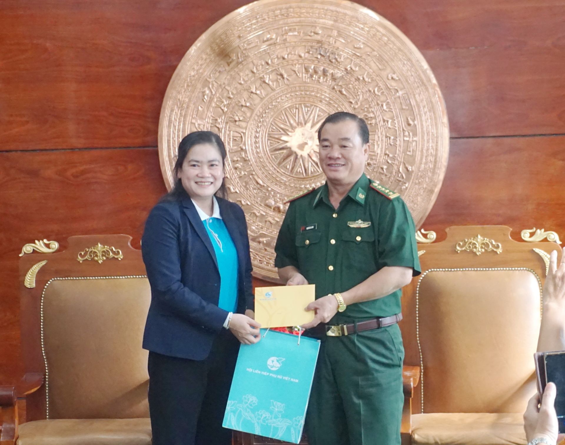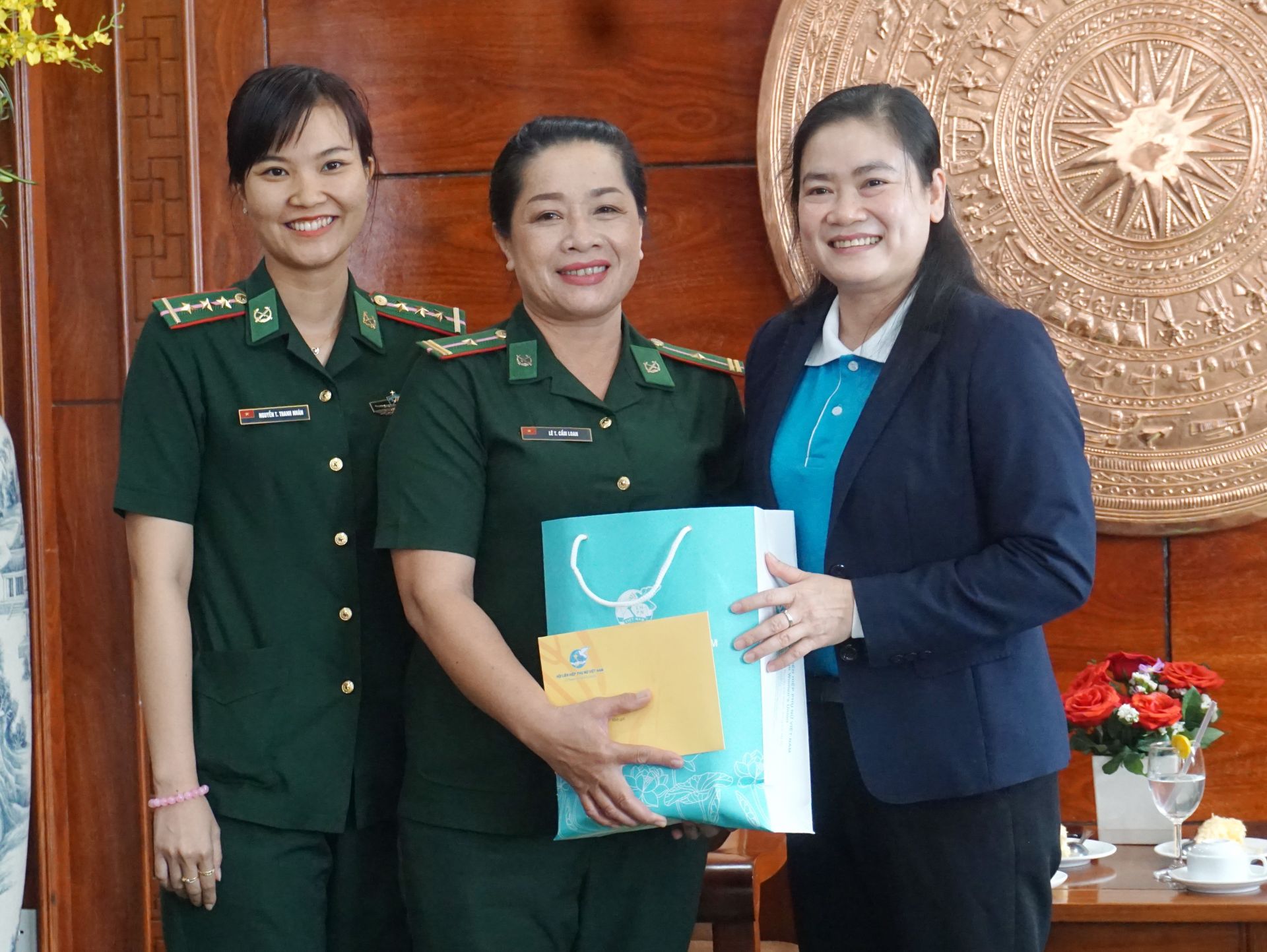 Bà Đỗ THị Thu Thảo, Phó chủ tịch TW Hội LHPN Việt Nam tặng quà cho Hội phụ nữ BĐBP tỉnh.
