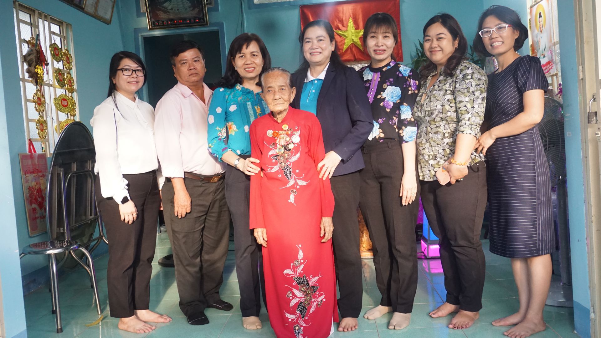 Đoàn công tác TW Hội, lãnh đạo Hội LHPN tỉnh, huyện Tân Biên chụp nhà lưu niệm cùng mẹ VNAH Nguyễn Thị Thùa.