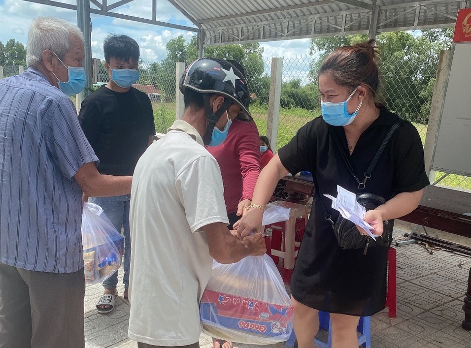 Gia đình chị Trần Thị Thảo-ngụ ấp Bàu Tràm Lớn, xã Tiên Thuận trao quà hỗ trọ cho các hộ nghèo, hộ có hoàn cảnh khó khăn do bị ảnh hưởng của dịch Covid-19.
