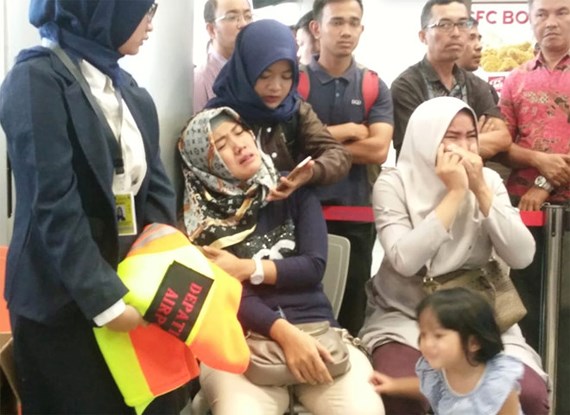 Người thân của các hành khách trên chuyến bay JT610 bật khóc tại sân bay Depati Amir ở Pangkal Pinang khi hay tin. Ảnh: REUTERS
