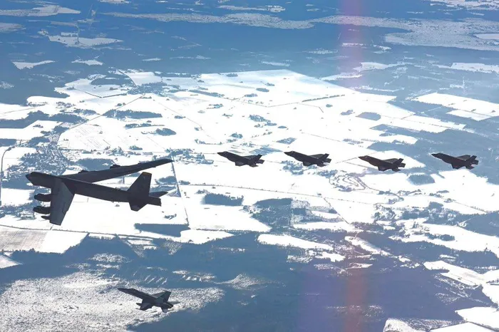 Ngày 24/2/2025, Không quân Phần Lan đã huấn luyện cùng với một máy bay ném bom chiến lược B-52 Stratofortress của Không quân Mỹ và các tiêm kích F-35 của Không quân Hà Lan trong không phận Estonia. Buổi huấn luyện kết thúc bằng một màn bay qua Tallinn để kỉ niệm Ngày Độc lập của Estonia. Ảnh: Không quân Phần Lan/X