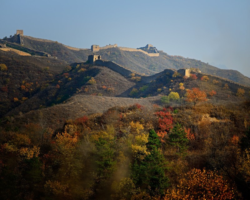 Nhìn từ xa, những Phong Hỏa đài hùng vĩ dưới nắng thu, bạn sẽ có cảm giác bức tường thành như vừa mới được xây dựng. Vạn Lý Trường Thành trải qua hàng nghìn năm lịch sử, vẫn giữ được nét đẹp nguyên sơ, thời gian có tàn phá đi vẻ ngoài nhưng dáng vẻ hùng tráng vẫn không thay đổi. Ảnh: Vũ Hân.