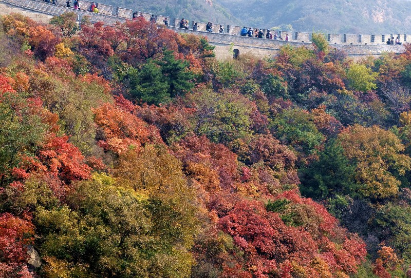 Thu sang, nắng vàng, cây lá thay màu áo, điểm nét nên thơ giữa khung cảnh Vạn Lý Trường Thành hùng vĩ. Cả đoạn tường thành 21.196 km với những đoạn dài được bao quanh bởi sắc vàng, sắc đỏ của cây cối tạo nên bức tranh thiên nhiên tuyệt diệu.