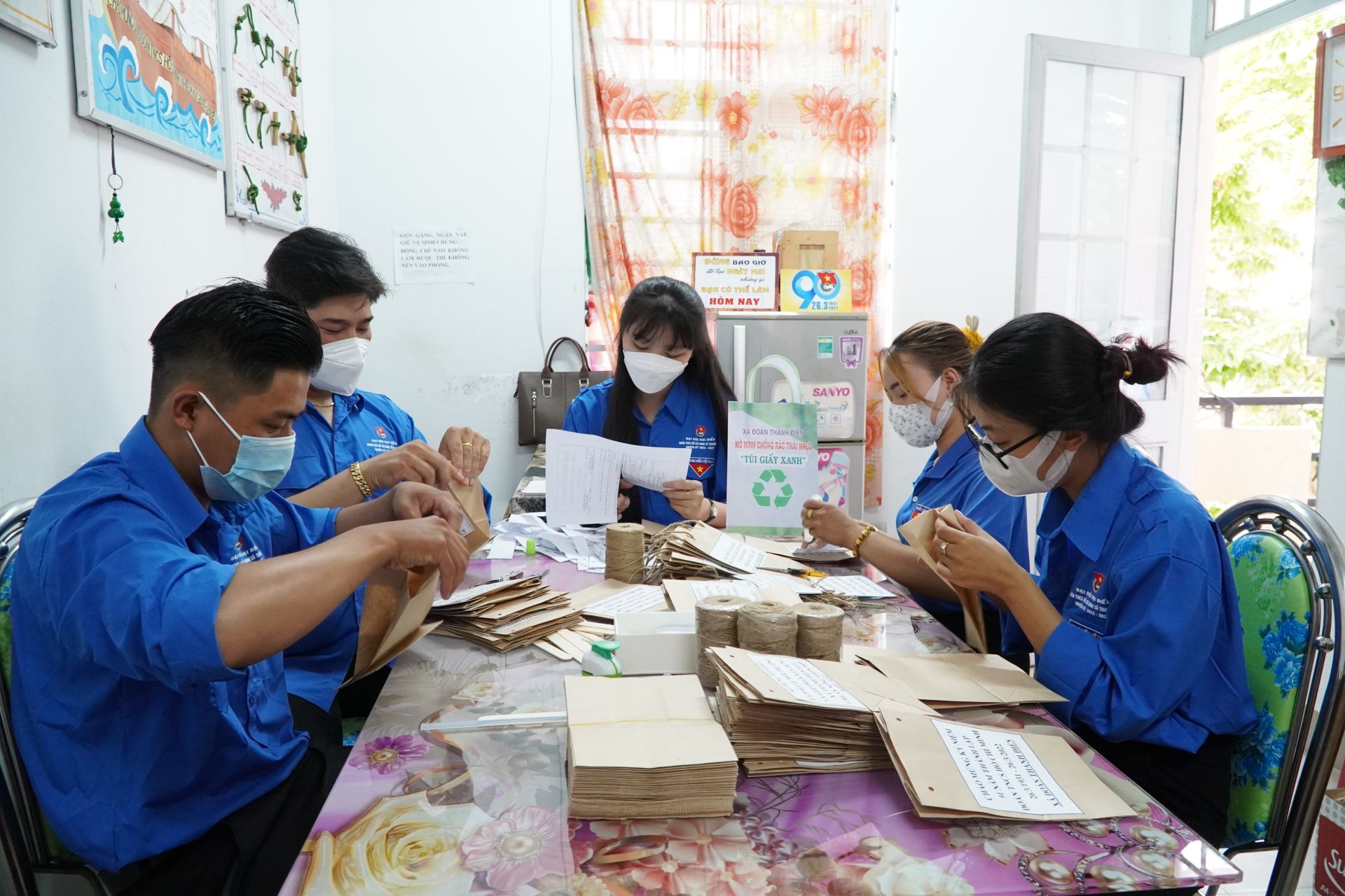 Đoàn viên xã Thanh Điền làm các túi giấy.