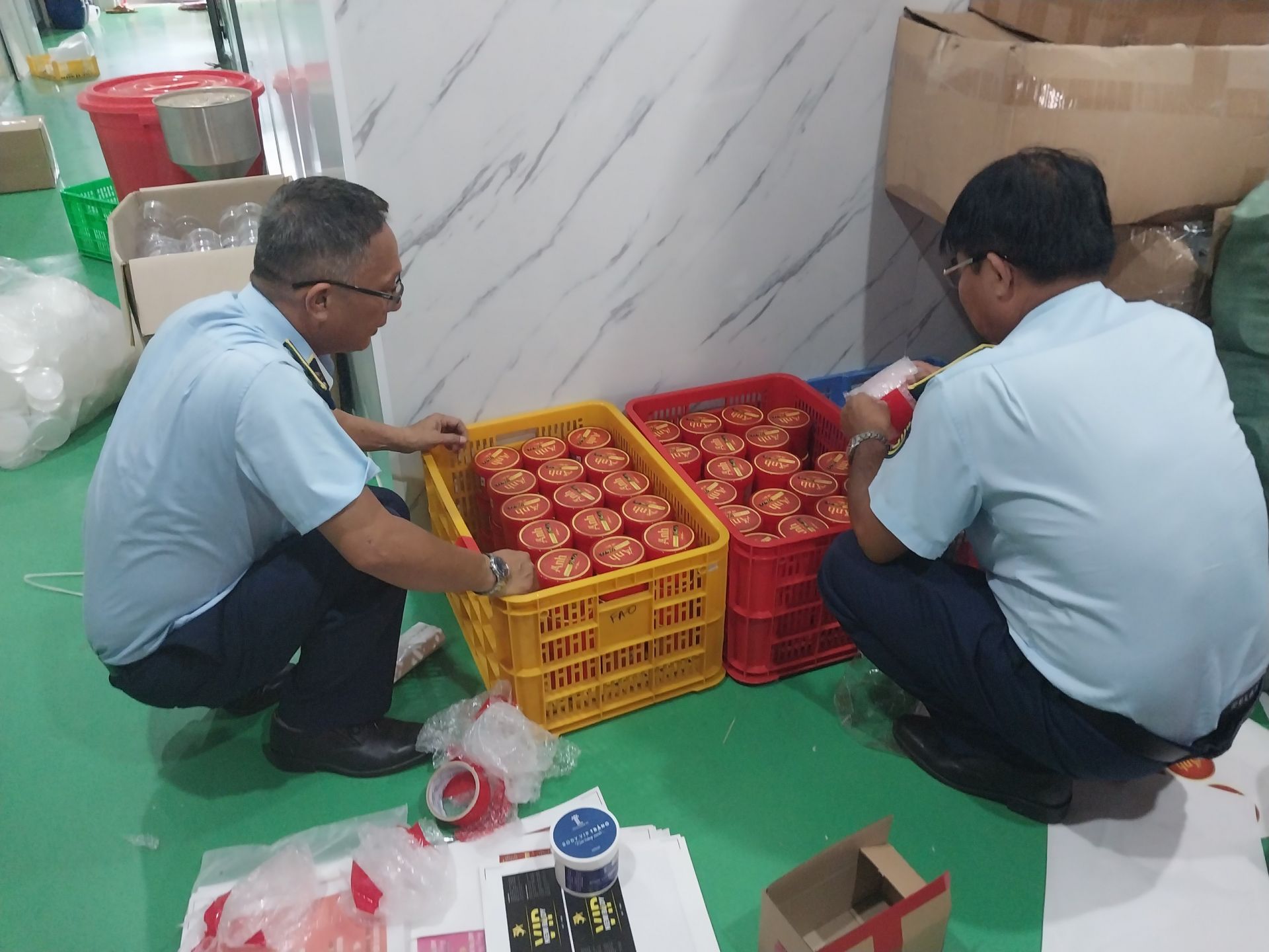 Tang vật vi phạm của cả hai hành vi là 166 hũ sản phẩm mỹ phẩm hiệu Anh kem body Pha Lê, loại 500g/hũ, ngày sản xuất: 8.2023, hạn sử dụng: 8.2026, có giá niêm yết trên sản phẩm là: 280.000 đồng/hũ.