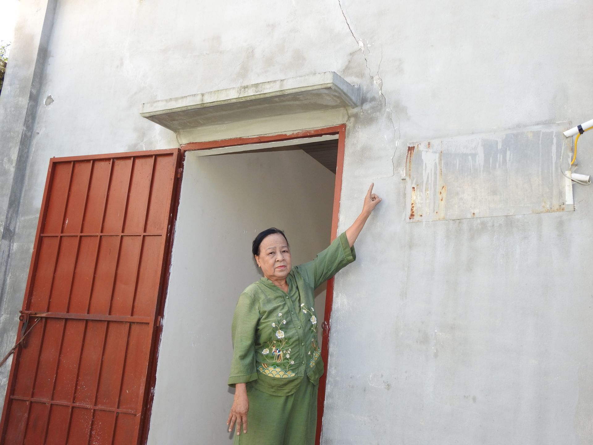 Cụ thể, nhà của bà Thuận đã được xây dựng trên 10 năm, với kết cấu chính của móng, cột, tường đều bằng gạch, lợp máy tôn, nền lát gạch men. Theo thời gian, tường nhà đã xuất hiện nhiều vết nứt, các vết nứt trên cửa hậu nhà bếp cũng đã được bà Thuận trực tiếp thuê thợ đến sửa chữa nhiều lần.