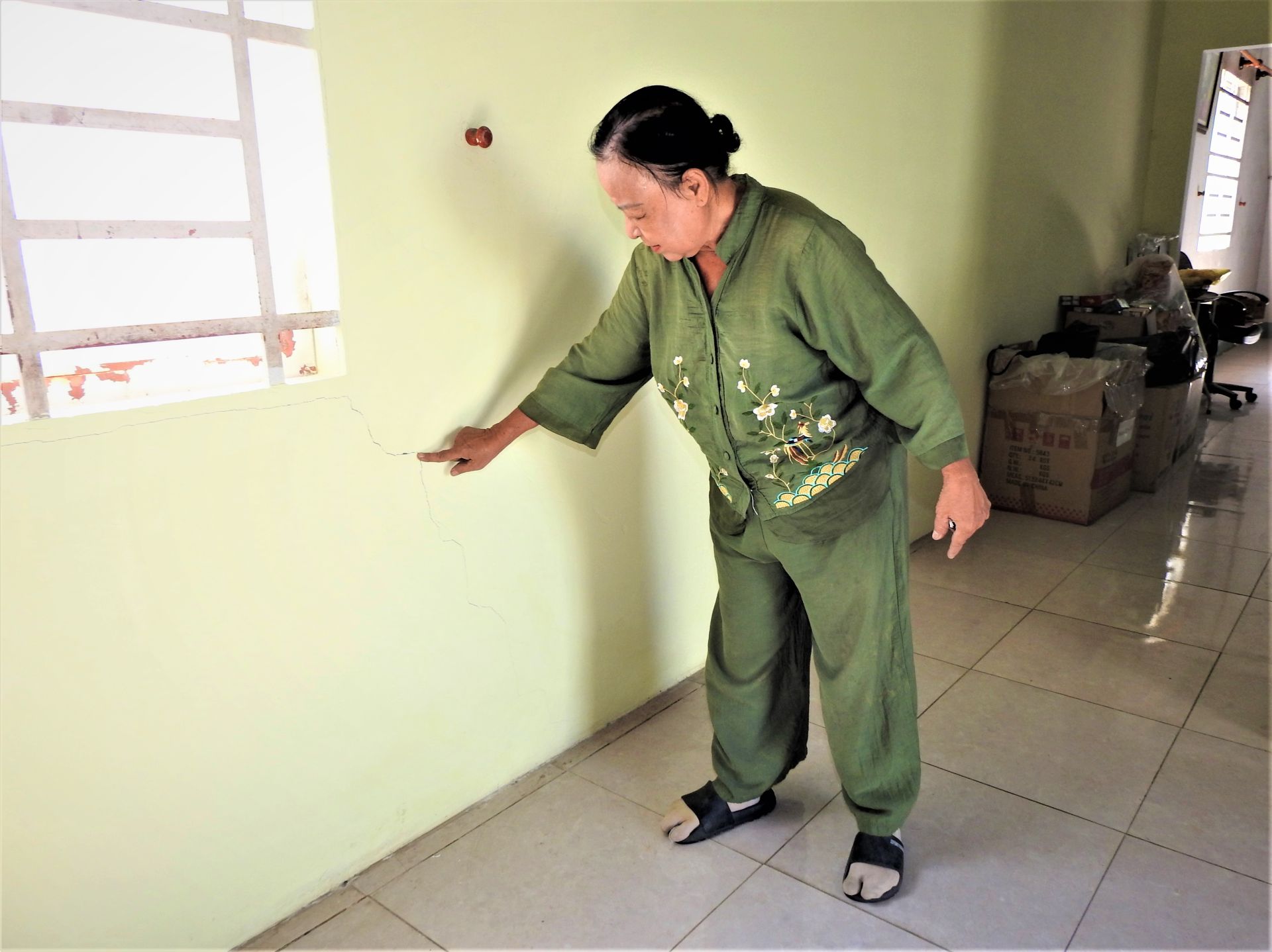 Ngoài ra, bà Thuận còn đề cập đến các vết hở gạch trong phòng vệ sinh, gạch men lát nền nhà bếp gần bên ngoài phòng vệ sinh bị hở bất thường, các vết nứt tường kéo dài tại khu vực phía trên cửa hậu nhà bếp (cửa ra đám đất trống bên hông nhà).