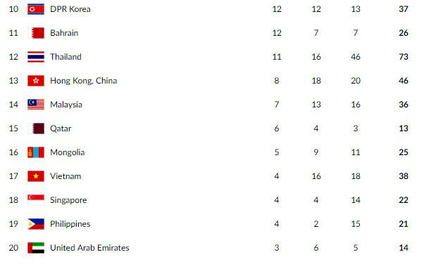 Đây cũng là một kỳ ASIAD thành công với các đoàn trong khu vực Đông Nam Á, với 6 đại diện xếp trong TOP 20 (Indonesia, Malaysia, Thái Lan, Việt Nam, Singapore và Philippines).