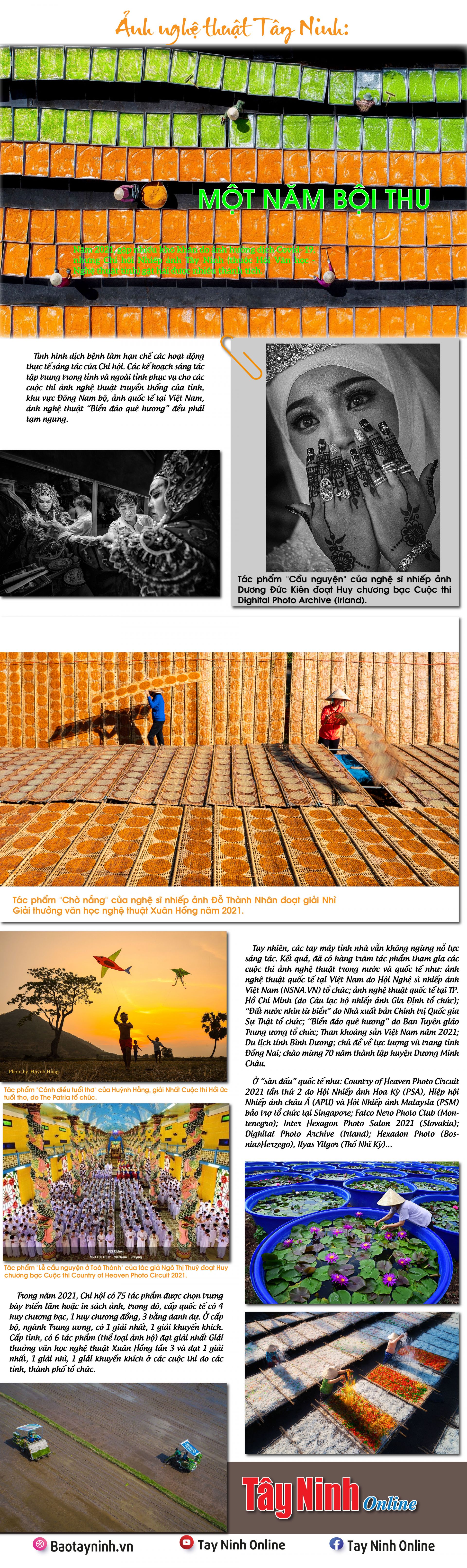 Năm 2021, gặp nhiều khó khăn do ảnh hưởng dịch Covid- 19, nhưng Chi hội Nhiếp ảnh Tây Ninh (thuộc Hội Văn học - Nghệ thuật tỉnh) gặt hái được nhiều thành tích.