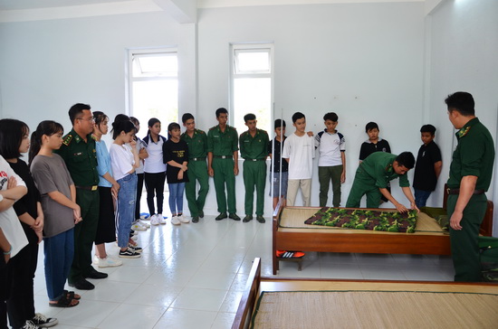 Các em học sinh chứng kiến cán bộ, chiến sĩ biên phòng chuẩn bị các bước để bắt đầu một ngày tuần tra bảo vệ biên giới.