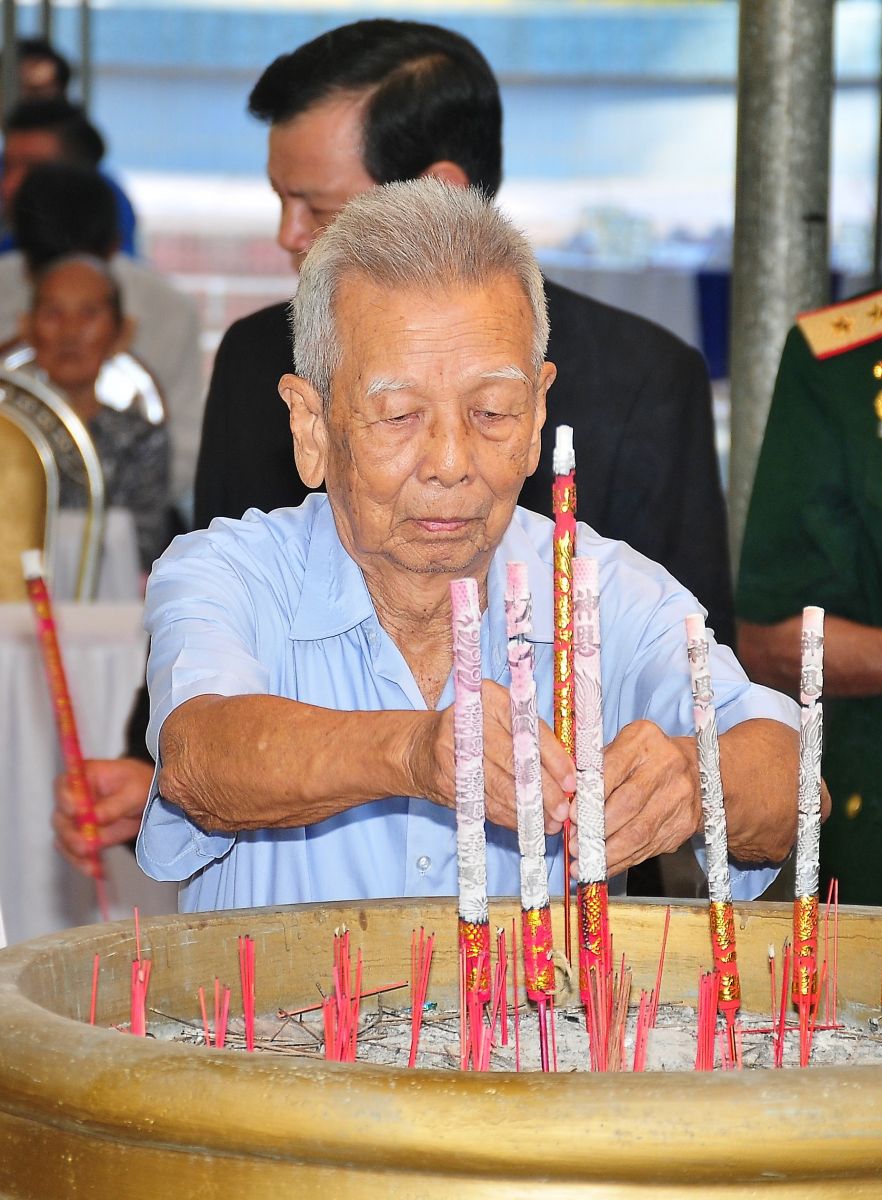 Cụ Lâm Quang Vinh thắp hương tưởng niệm chiến sĩ rừng Rong trong cuộc họp mặt truyền thống năm 2018 tại Khu di tích lịch sử Hội thề Rừng Rong. Ảnh Đại Dương.