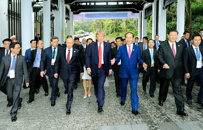 Chủ tịch nước Trần Đại Quang (giữa) sánh bước cùng lãnh đạo các nền kinh tế lớn như Tổng thống Mỹ Donald Trump, Chủ tịch Trung Quốc Tập Cận Bình và Tổng thống Nga Vladimir Putin sau phiên họp kín của Diễn đàn hợp tác kinh tế Châu Á- Thái Bình Dương ngày 11-11-2017 ở Đà Nẵng.