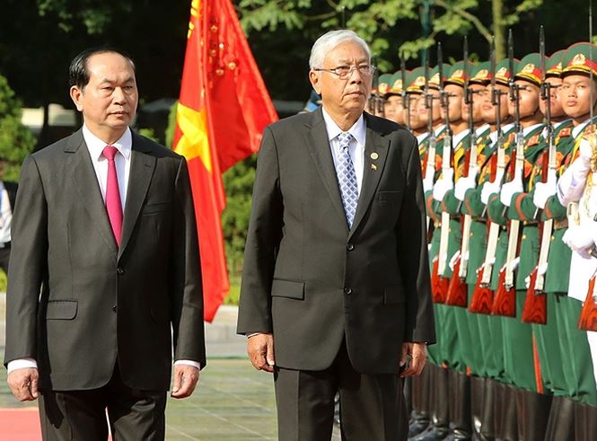 Chủ tịch nước Trần Đại Quang và Tổng thống Myanmar Htin Kyaw duyệt đội danh dự tại Phủ Chủ tịch tháng 10-2016.