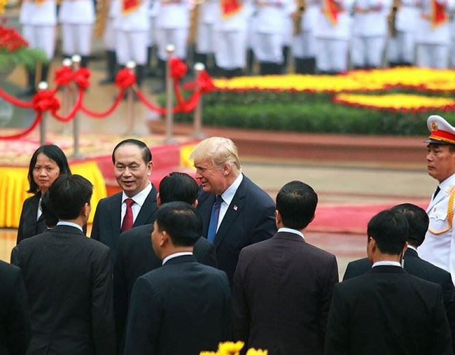 Chủ tịch nước Trần Đại Quang giới thiệu các quan chức cấp cao của Việt Nam cho Tổng thống Mỹ Donald Trump trong lễ đón chính thức dành cho nhà lãnh đạo Mỹ ở Hà Nội tháng 11-2017.