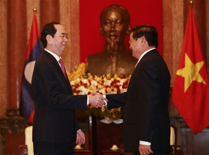 Chủ tịch nước Trần Đại Quang chào đón Thủ tướng Lào Thongloun Sisoulith tại Phủ Chủ tịch.